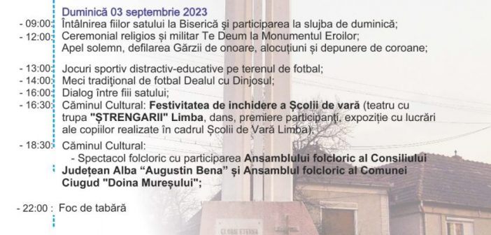 - 18:30 – Spectacol folcloric cu participarea Ansamblului Folcloric „Augustin Bena” al Județului Alba și Ansamblul „Doina Mureșului” Ciugud – Căminul Cultural Limba;