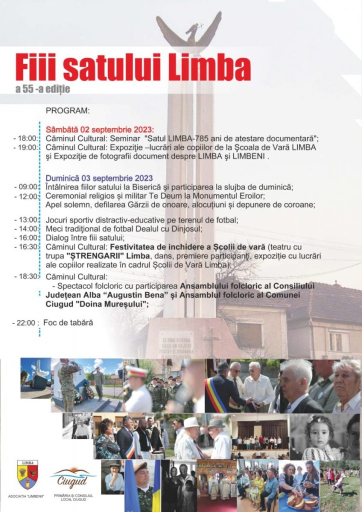 Satul Limba, localitate care aparține de comuna Ciugud, va găzdui sâmbătă, 2 septembrie și duminică, 3 septembrie, ediția cu numărul 55 a evenimentului devenit tradiție „Fiii satului”.