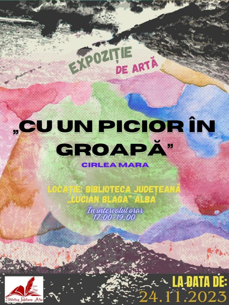 Vineri, 24 noiembrie 2023, la Biblioteca Județeană „Lucian Blaga” Alba ( Alba Iulia, Str. Trandafirilor, nr. 22), va fi vernisată la ora 17:00, expoziţia de artă plastică a elevei Mara Cirlea, intitulată „Cu un picior în groapă”. Expoziția va fi prezentată de autoarea tablourilor iar evenimentul le va avea ca amfitrioane pe bibliotecarele Liudmila Cioflică și Luiza Pop.