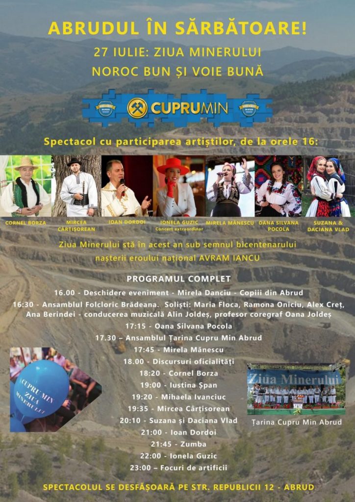 Vă invităm pe toți să sărbătorim la spectacolul în aer liber ce va avea loc în 27 iulie, la Abrud, str. Republicii 12.