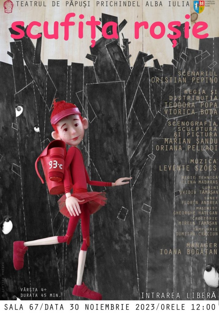 Haideți să sărbătorim împreună, prin teatru, acest eveniment al nostru, al tuturor! Așadar, vă așteptăm cu mult drag joi, 30 decembrie 2023, de la orele 12:00, la Sala 67 a Teatrului de Păpuși „Prichindel”, la spectacolul care aduce zâmbete și bună dispoziție – „Scufița roșie”, regia Viorica Boda și Teodora Popa. Intrarea este gratuită!