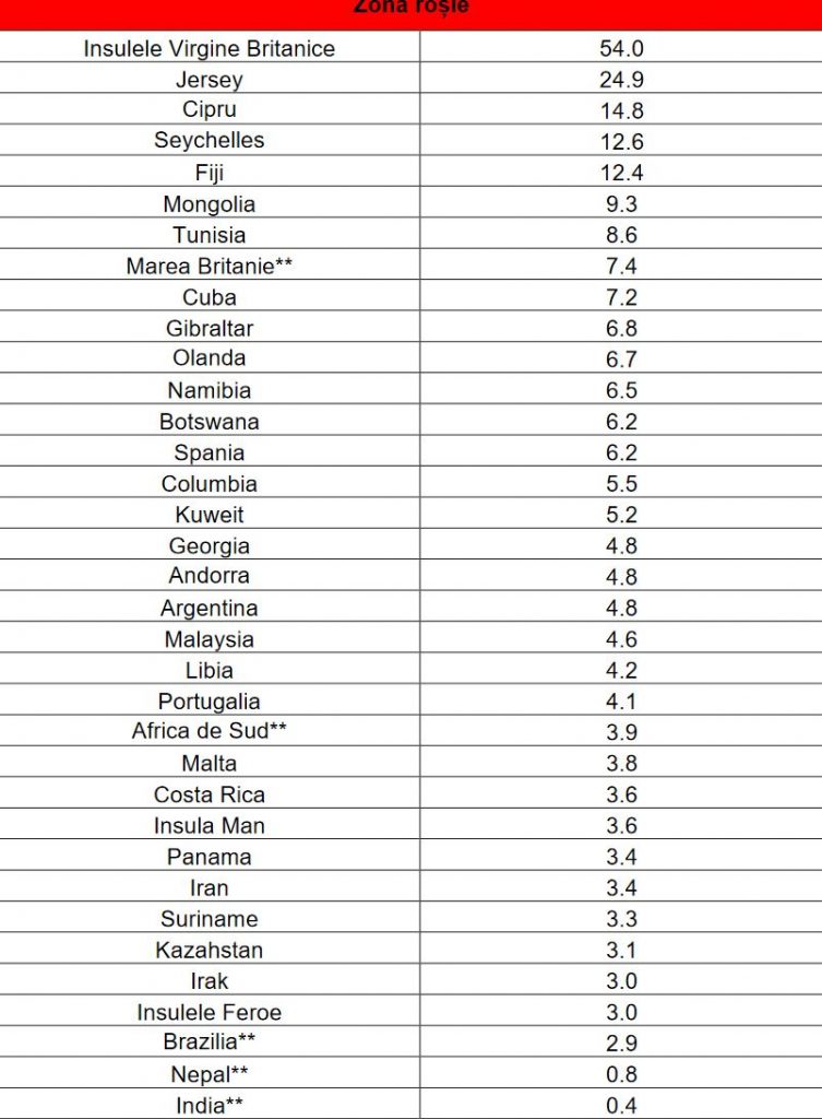 Comitetul Național pentru Situații de Urgenţă (CNSU) a adoptat joi, o nouă “listă galbenă” cu țările cu risc epidemiologic ridicat.