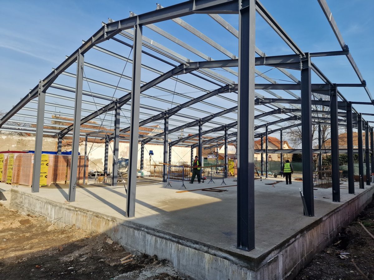 Echipele de muncitori au montat structura metalică a noii săli de sport.