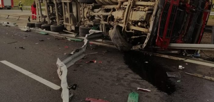 Un camion încărcat cu nisip s – a răsturnat, vineri seara, pe Autostrada A10 Turda – Aiud.