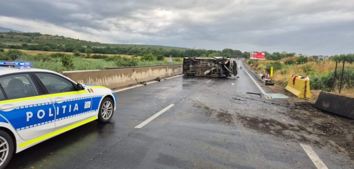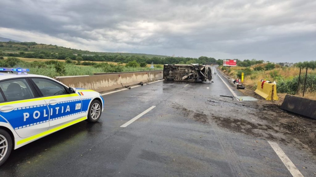 Accident pe DN 1, în zona Veștem: un microbuz s-a răsturnat, doi pasageri răniți, printre care un copil de 2 ani