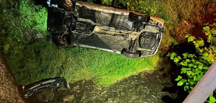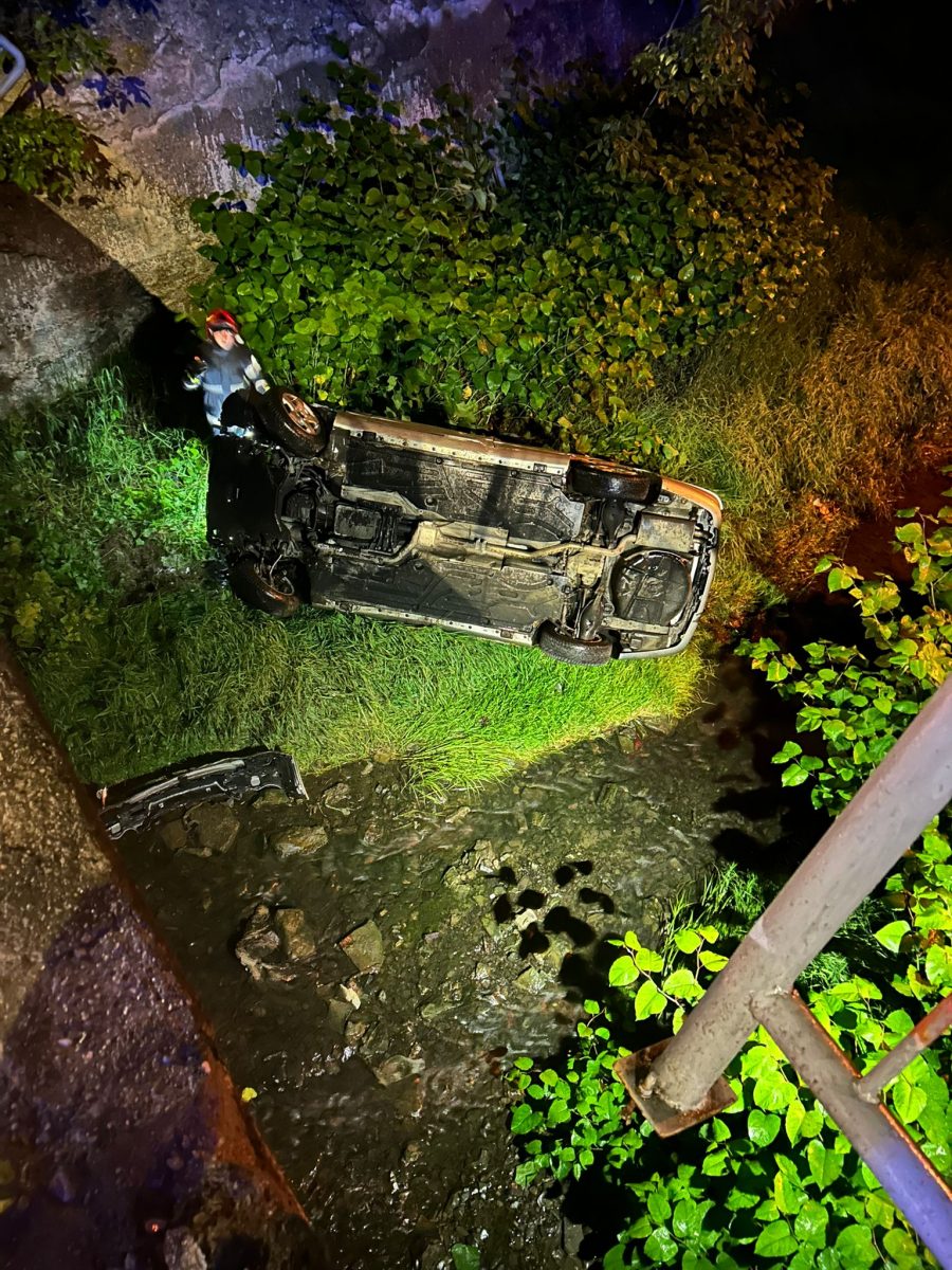 Echipajele operative au găsit la fața locului un autoturism răsturnat în afara părții carosabile, lângă un pod. Din fericire, nu au existat victime încarcerate. Un tânăr de 18 ani a fost evaluat de către paramedici, însă nu a necesitat transportul la spital.