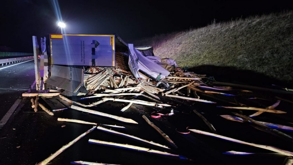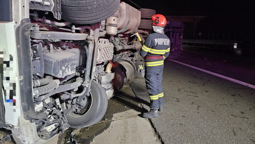 În accident a fost implicat un autocamion încărcat cu lemne, care s-a răsturnat pe carosabil. Inițial, existau informații despre o posibilă persoană încarcerată, însă, la sosirea echipajelor de intervenție, s-a constatat că nu sunt victime încarcerate.