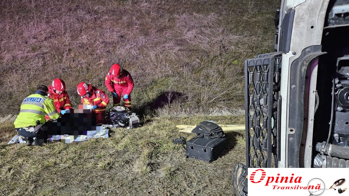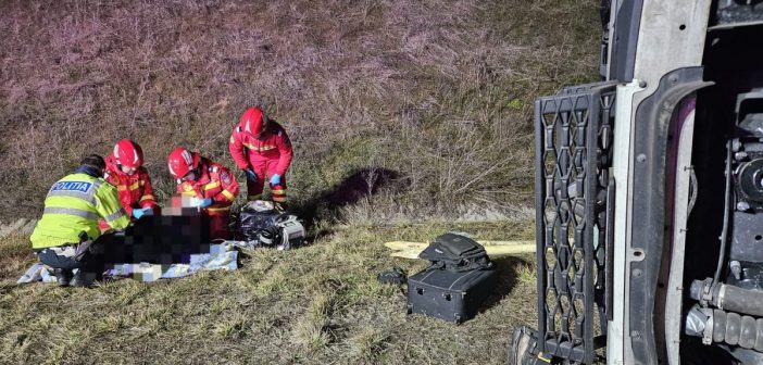 Șoferul autocamionului este asistat medical de echipajul SMURD.