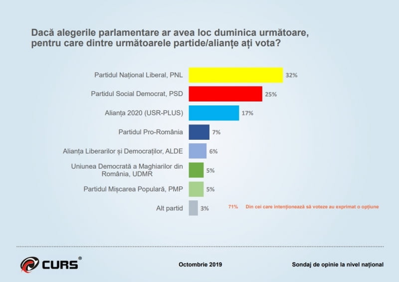 Centrul de Sociologie Urbană și Regională – CURS a dat publicităţii cel mai nou sondaj de tip omnibus realizat în perioada 14-21 octombrie. Potrivit cercetării sociologice, în cazul în care duminică ar avea loc alegeri parlamentare, PNL şi USR ar avea împreună o majoritate fragilă, după redistribuiri.