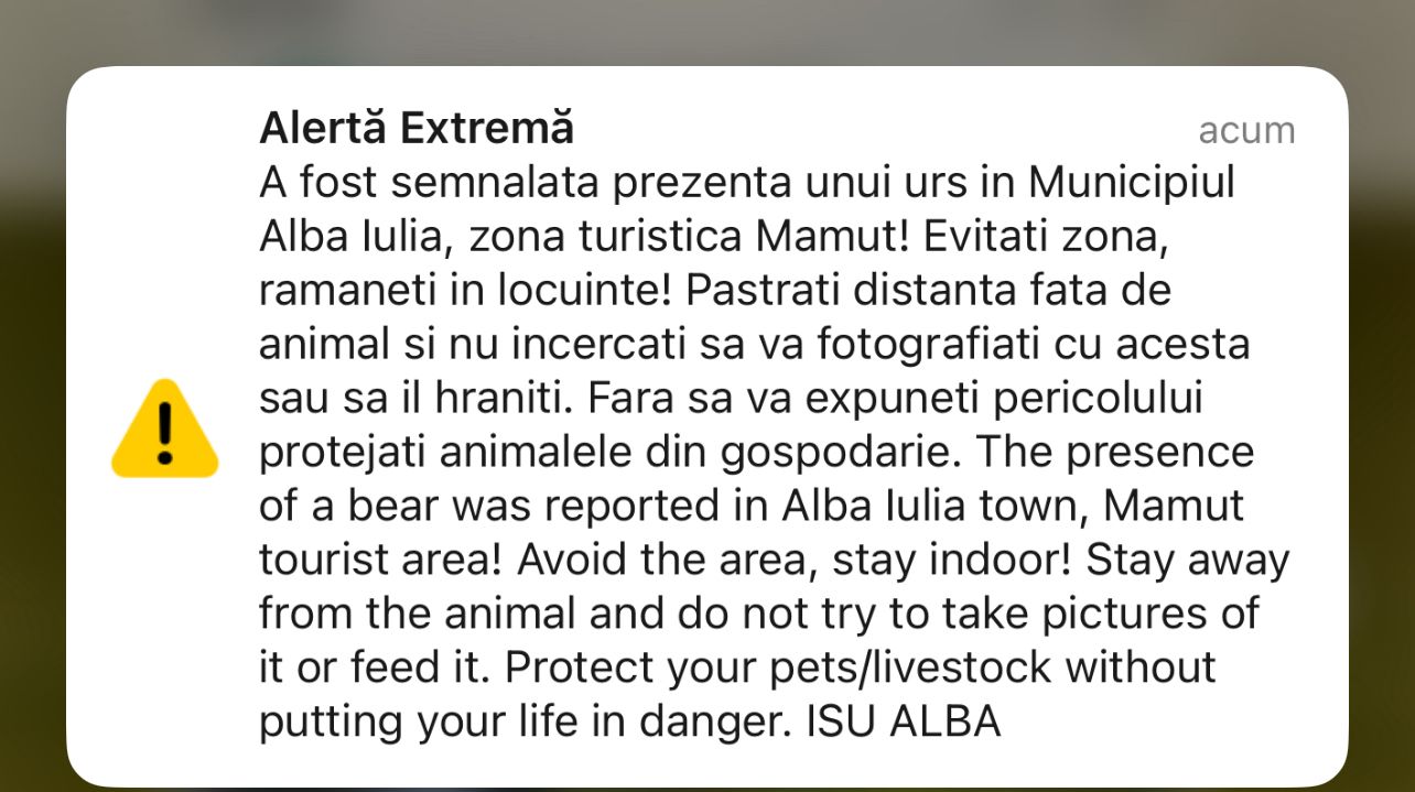Un urs a fost semnalat joi, 5 iunie, în zona turistică Mamut din municipiul Alba Iulia. Inspectoratul pentru Situații de Urgență (ISU) Alba a transmis un mesaj RO-ALERT către populație, avertizând asupra pericolului.