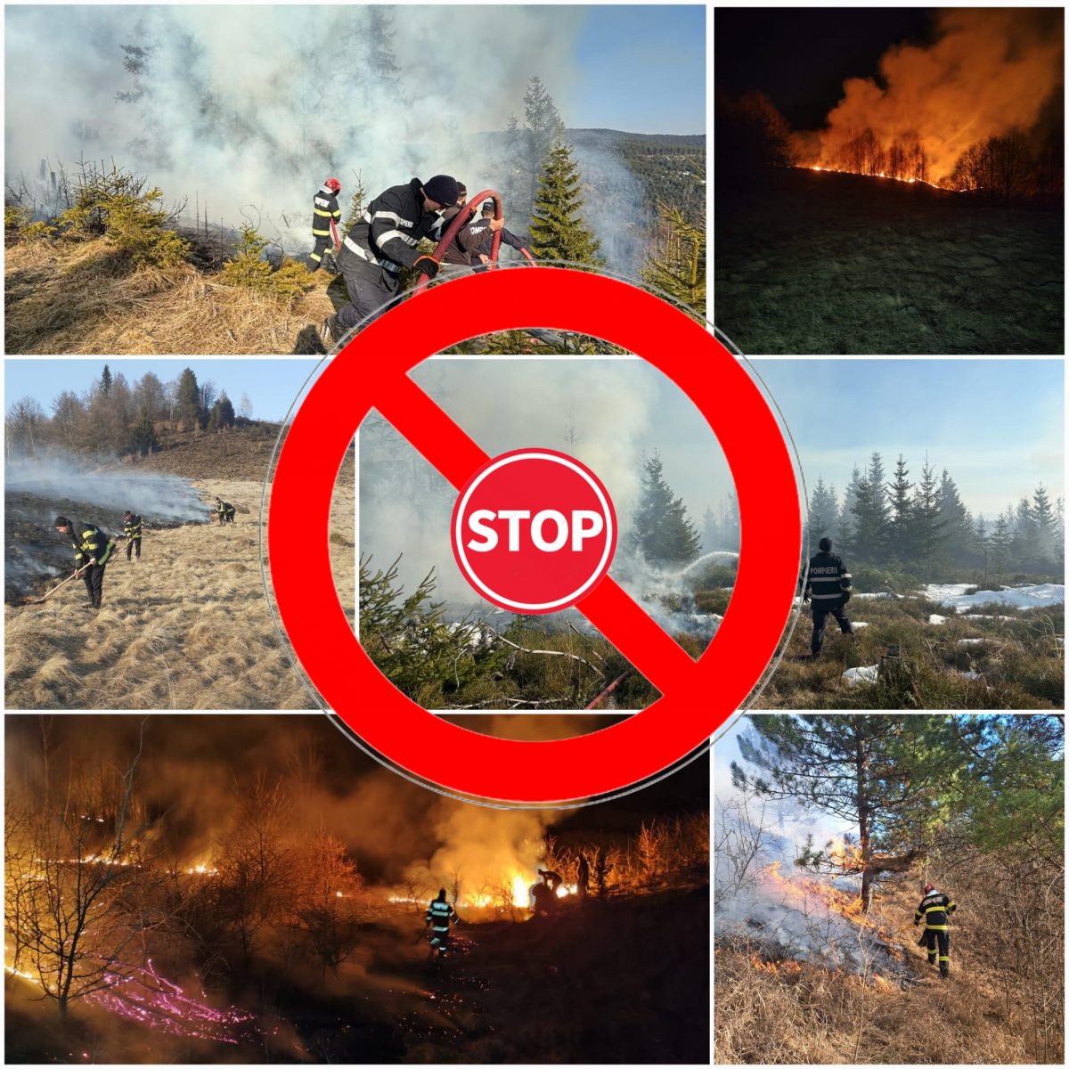 Numai în ultimele 24 de ore, personalul ISU, SVSU și silvic au fost alertați să intervină la 8 incendii de vegetație uscată, unele dintre acestea fiind încă în desfăsurare.