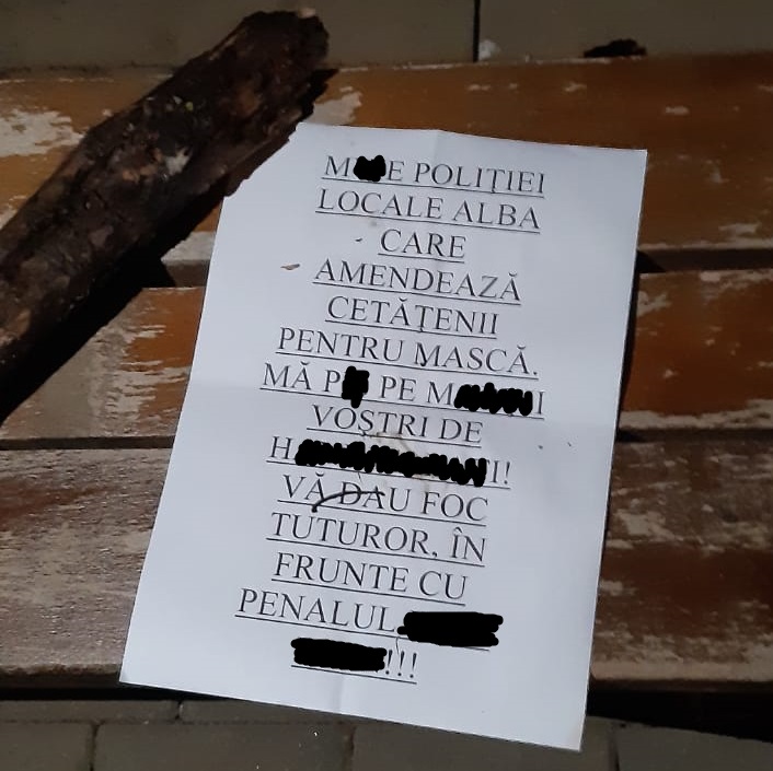 În biletul de amenințare, incendiatorul își exprimă revolta față de amenzile care se dau zi de zi, în municipiu, de către polițiștii locali, pentru nepurtarea măștii de protecție.