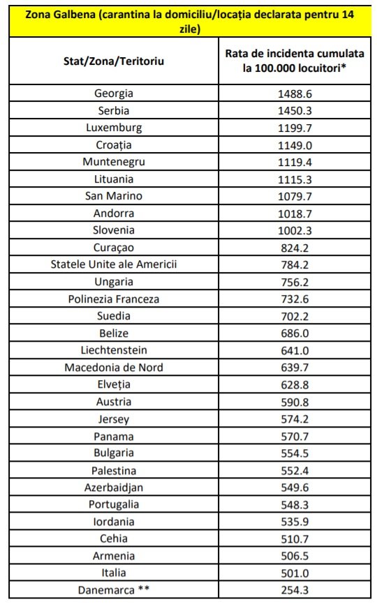 Conform hotărârii adoptate de Comitetul Național pentru Situații de Urgență, 30 de țări sunt în zona galbenă. Persoanele care vin din aceste țări în România intră în carantină 14 zile. Autoritățile au scos două state de pe listă (Polonia şi Kosovo) și au introdus alte cinci – Belize, Insula Jersey, Panama, Palestina, Azerbaidjan.