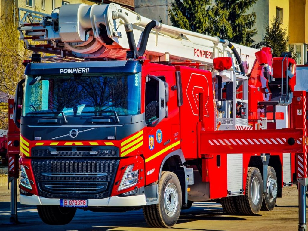 Autoplatformă de salvare 𝐕𝐨𝐥𝐯𝐨 𝐅𝐌 𝟔𝐱𝟐 de 500CP cu dublă comandă (înălțime de salvare max 45 m), cu o capacitate de 500 kg și fără limite de rotire, tun de apa de 3800 l/minut, vehiculul permite intervenții de salvare sub cota solului, de aproximativ – 8,2m.