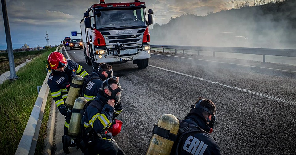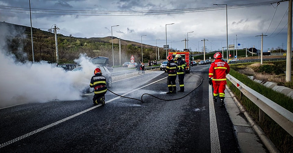 – 1 incendiu autoturism aflat la ieșirea de pe autostrada A10, 3 persoane autoevacuate;