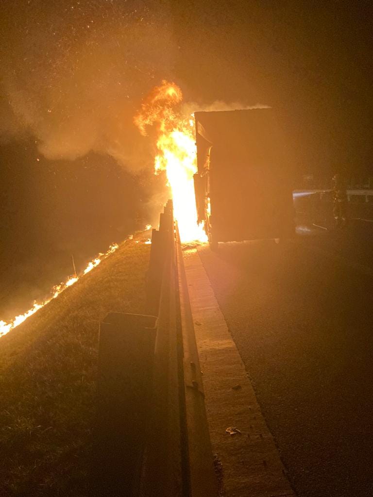 Un autocamion a fost duminică seara, cuprins de flăcări pe Autostrada A10, la ieșirea din zona localității Decea.