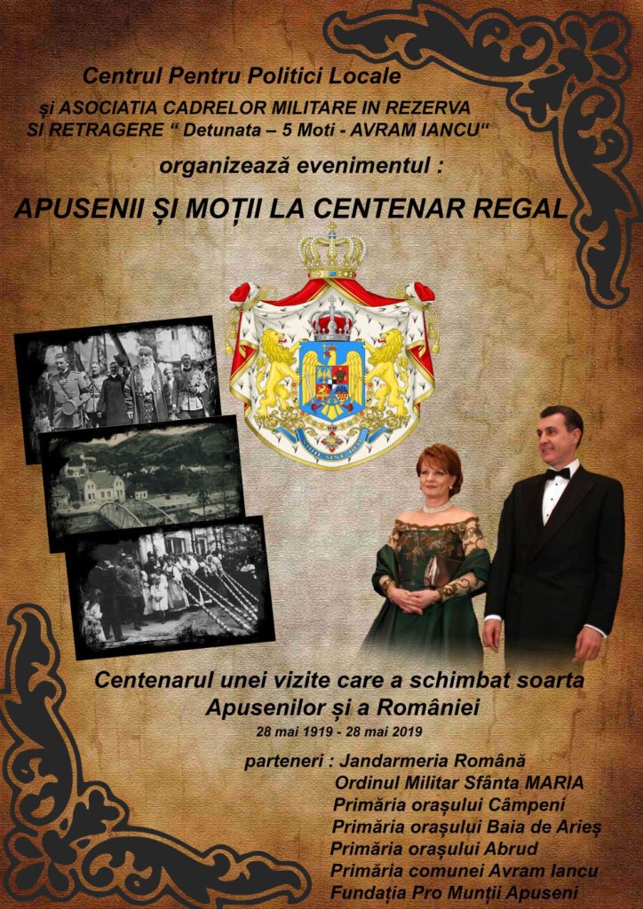 Centrul pentru Politici Locale și Asociația Cadrelor Militare în Rezervă și Retragere “Detunata-5 Moți- Avram Iancu” vă invită să sărbătorim împreună 100 de ani de la prima vizită a Familiei Regale a României în Munții Apuseni.