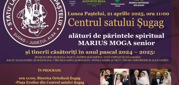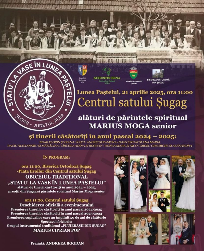 Primăria Comunei Șugag, Consiliul Județean Alba și Centrul de Cultură ,,Augustin Bena”, în parteneriat cu Biserica Ortodoxă Șugag, organizează la ȘUGAG o nouă ediție a obiceiului tradițional „STATU′ LA VASE ÎN LUNEA PAȘTELUI”, luni, 21 aprilie 2025, cu începere de la ora 11:00.