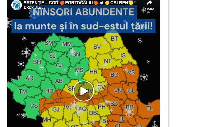 „Având în vedere avertizările transmise de Administraţia Naţională de Meteorologie (ANM) care anunţă în mai multe zone ale ţării cod galben şi portocaliu de precipitaţii şi viscol până duminică, 26.11.2023, ora 18:00, facem apel la conducătorii auto să evite deplasările în zonele vizate de aceste fenomene meteorologice”, se menţionează în comunicatul CNAIR, transmis sâmbătă AGERPRES.