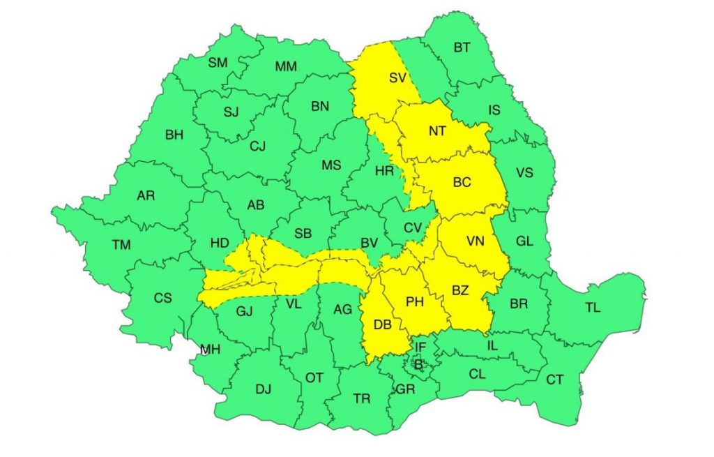 Fenomenele meteo periculoase se vor manifesta în 15 județe din vestul Moldovei, nordul Munteniei și zonele montane ale Carpaților Orientali și Meridionali. Regiunile afectate sunt: Suceava, Neamț, Bacău, Vrancea, Buzău, Prahova, Dâmbovița, Argeș, Brașov, Covasna, Harghita, Sibiu, Vâlcea, Gorj și Caraș-Severin.