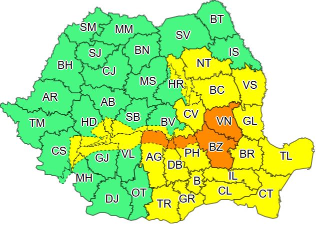 Potrivit meteorologilor, în intervalul 27 ianuarie, ora 10:00 – 29 ianuarie, ora 10:00, Codul galben de vreme rea va fi valabil în Dobrogea, Muntenia, Carpaţii Meridionali şi local în Moldova, sud-estul Transilvaniei şi în Carpaţii Orientali vor fi precipitaţii însemnate cantitativ şi se vor acumula în general 25- 40 l/mp.