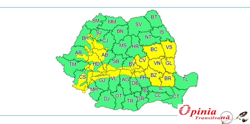 Codul galben va intra în vigoare de astăzi, de la ora 16.00, și va fi valabil până luni, la ora 12.00.
