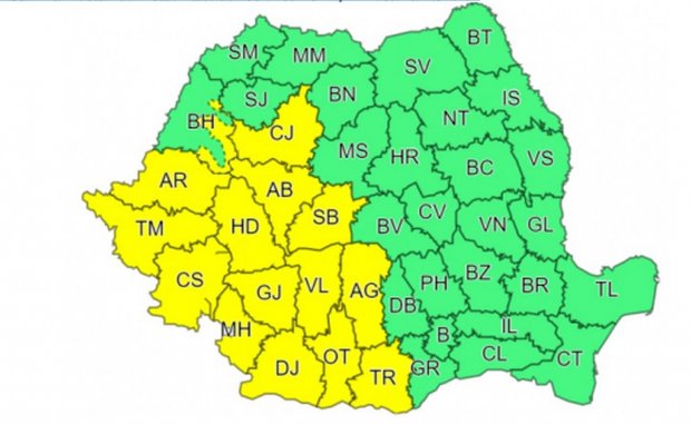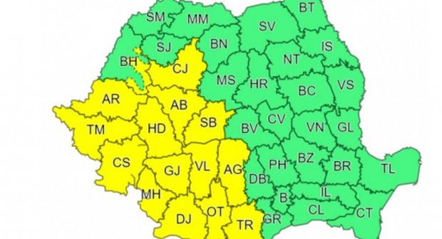 Alerta vizează judeţele Argeş, Vâlcea, Dolj, Mehedinţi, Gorj, Sibiu, Alba, Cluj, Bihor, Arad, Timiş, Caraş Severin, Hunedoara, Teleorman şi Olt.