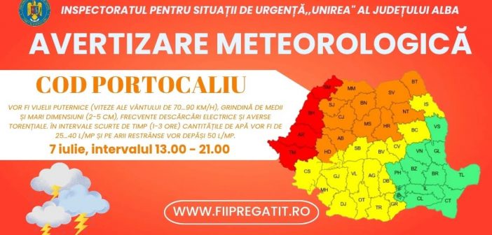 Administrația Națională de Meteorologie a emis o avertizare de Cod Portocaliu pentru instabilitate atmosferică accentuată, valabilă luni, 7 iulie 2025, în intervalul orar 13:00 – 21:00, pentru întreg județul Alba.