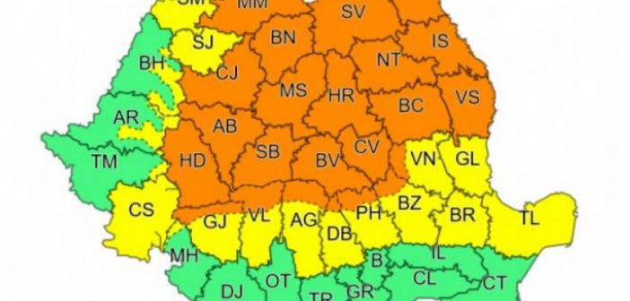 Administraţia Naţională de Meteorologie a emis un Cod portocaliu va fi valabil în perioada marți ora 10.00 – miercuri ora 3.00.