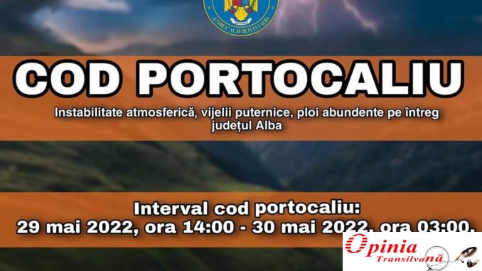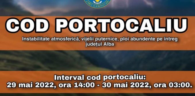 Începând de duminică, 29 mai 2022, ora 14:00, până luni, 30 mai 2022, ora 03:00, întreg județul Alba se află sub avertizarea de COD PORTOCALIU, care vizează instabilitate atmosferică temporar-accentuată și ploi abundente.