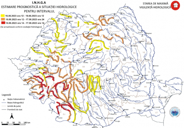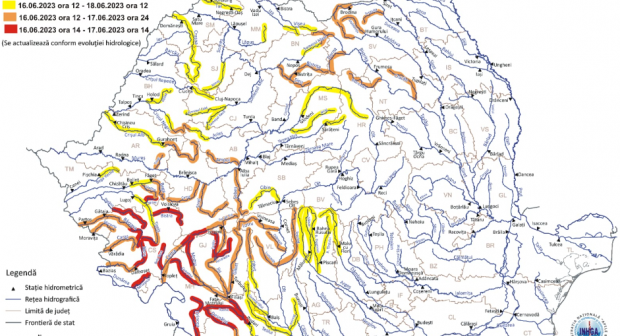 Conform situaţiei hidrometeorologice actuale şi prognozei meteorologice pentru următoarele 36 de ore, specialiștii I.N.H.G.A. au actualizat Avertizarea Hidrologică, instituind Cod Roșu de inundații începând de astăzi, 16 iunie, ora 14:00, până mâine, la aceeași oră.