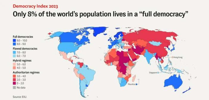 Restul ţărilor sunt împărţite între „regim hibrid” şi „regim autoritar”, conform unui indice calculat pe baza a cinci criterii: procesele electorale şi pluralismul, funcţionarea guvernului, participarea politică, cultura politică şi libertăţile civile.