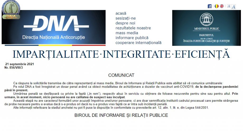 Direcția Națională Anticorupție a confirmat informațiile prezentate, în mass media, privind o anchetă ce ar viza modul în care au fost achiziționate 120 de milioane de doze de vaccin anti-COVID. Într-un comunicat oficial, DNA precizează că este cercetat unu posibil abuz în serviciu și că, momentan, nu sunt persoane vizate.