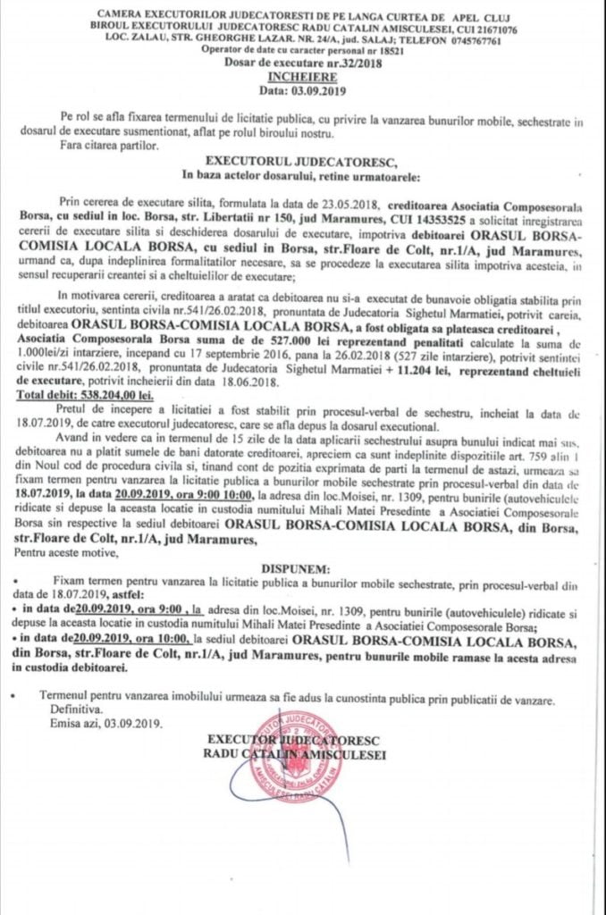 Prin urmare Primăria Borșa este executată silit, urmând să rămână fără mai multe bunuri.