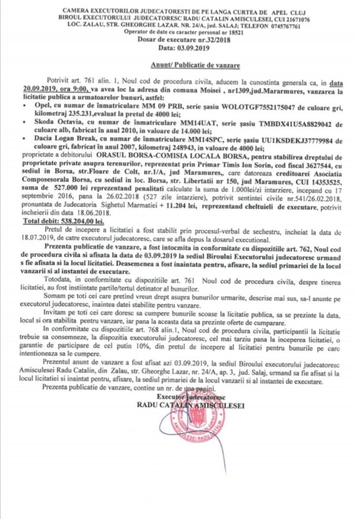 Potrivit art. 761 alin. 1, Noul cod de procedura civila, aducem la cunostinta generala ca, in data 20.09.2019, ora 10:00, va avea loc la sediul debitorului ORASUL BORSA-COMISIA LOCALA BORSA, pentru stabilirea dreptului de proprietate private asupra terenurilor, reprezentat prin Primar Timis Ion Sorin, cod fiscal 3627544, cu sediul in Borsa, str.Floare de Colt, nr.1/A, jud Maramures, vanzarea la licitatie publica a urmatoarelor bunuri, astfel:
