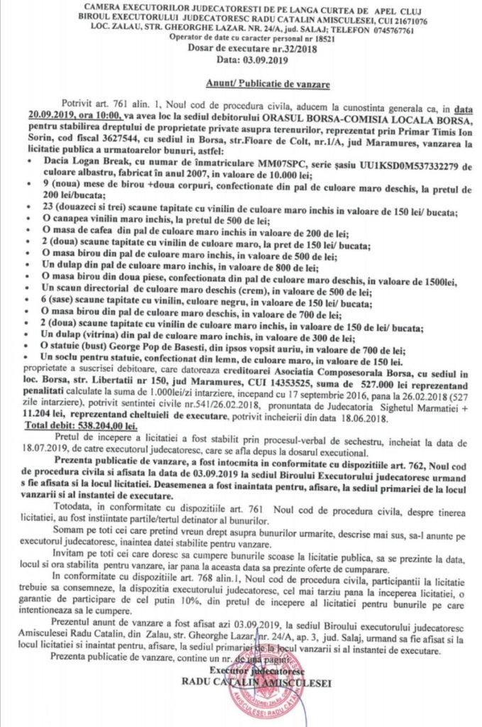 Situație fără precedent pentru Primăria orașului Borșa. Bunurile instituției sunt scoase la vânzare de un executor judecătoresc.