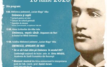 Consiliul Județean Alba și Biblioteca Județeană „Lucian Blaga” Alba vă propun joi, 15 iunie 2023, un program omagial dedicat lui Mihai Eminescu, la 134 de ani de la moartea poetului.