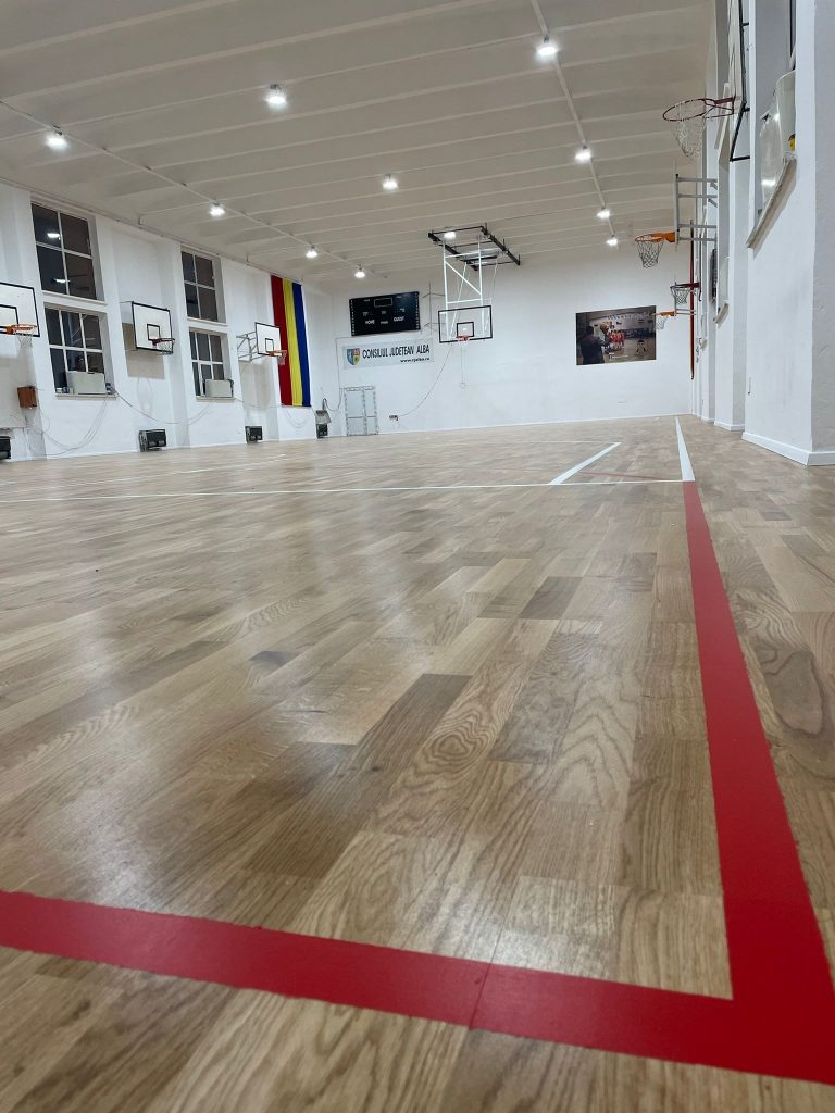 Suprafața de joc a fost refăcută prin refacerea substratului din beton și montarea unui parchet din lemn masiv, special conceput pentru sălile de sport, unul prietenos cu articulațiile sportivilor noștri, atât de solicitate.