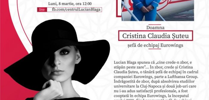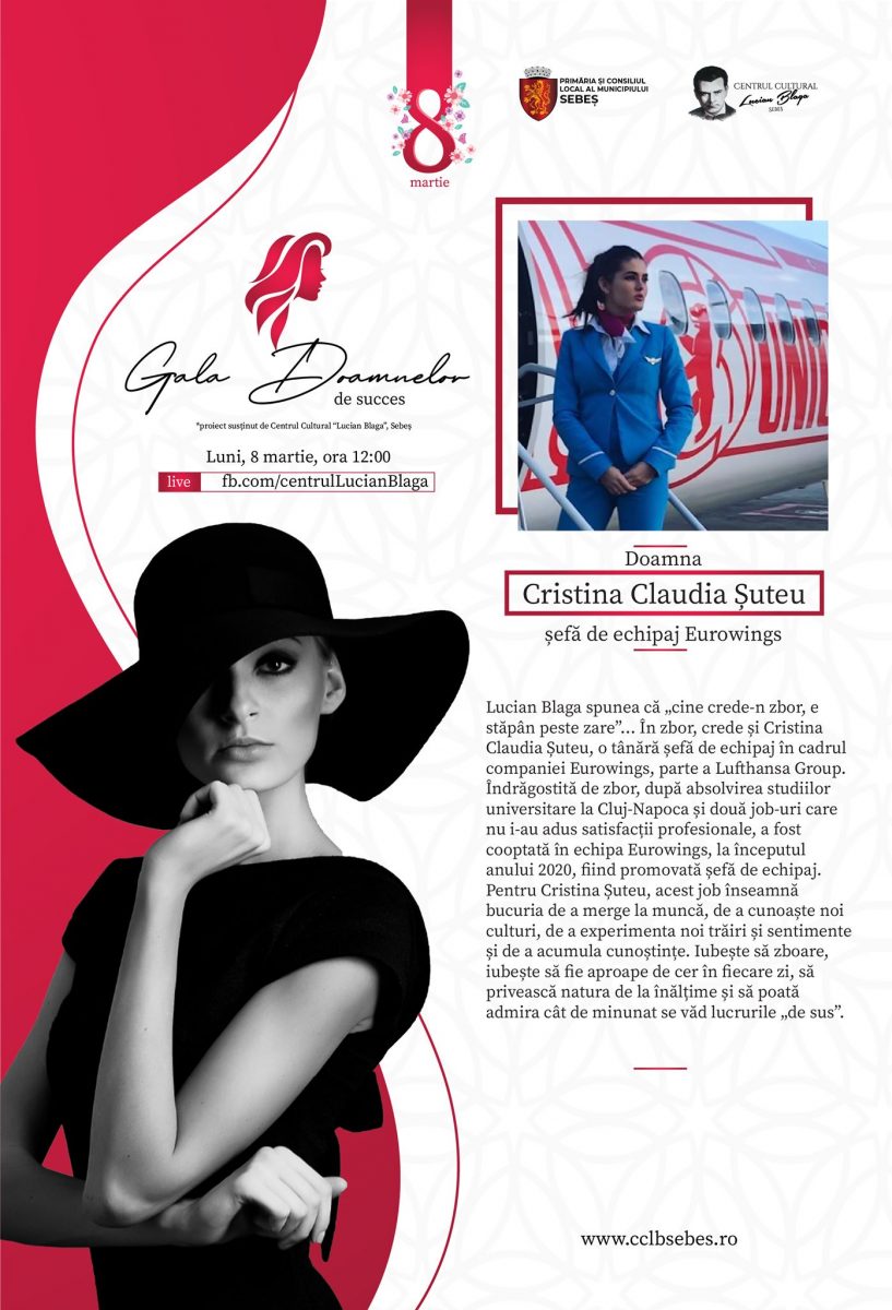 Lucian Blaga spunea că „cine crede-n zbor, e stăpân peste zare”… În zbor, crede și Cristina Claudia Șuteu, o tânără șefă de echipaj în cadrul companiei Eurowings, parte a Lufthansa Group. Îndrăgostită de zbor, după absolvirea studiilor universitare la Cluj-Napoca și două job-uri care nu i-au adus satisfacții profesionale, a fost cooptată în echipa Eurowings, la începutul anului 2020, fiind promovată șefă de echipaj. Pentru Cristina Șuteu, acest job înseamnă bucuria de a merge la muncă, de a cunoaște noi culturi, de a experimenta noi trăiri și sentimente și de a acumula cunoștințe. Iubește să zboare, iubește să fie aproape de cer în fiecare zi, să privească natura de la înălțime și să poată admira cât de minunat se văd lucrurile „de sus”.
