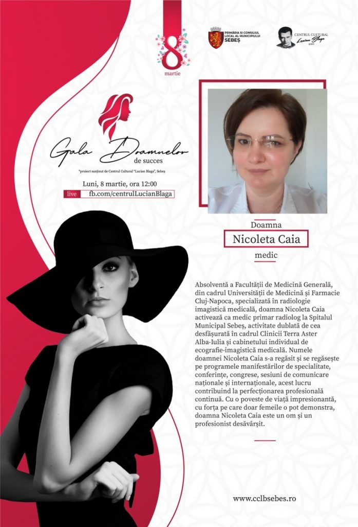 Absolventă a Facultății de Medicină Generală, din cadrul Universității de Medicină și Farmacie Cluj-Napoca, specializată în radiologie imagistică medicală, Nicoleta Caia activează ca medic primar radiolog la Spitalul Municipal Sebeș, activitate dublată de cea desfășurată în cadrul Clinicii Terra Aster Alba-Iulia și cabinetului individual de ecografie-imagistică medicală. Numele Nicoleta Caia s-a regăsit și se regăsește pe programele manifestărilor de specialitate, conferințe, congrese, sesiuni de comunicare naționale și internaționale, acest lucru contribuind la perfecționarea profesională continuă. Cu o poveste de viață impresionantă, cu forța pe care doar femeile o pot demonstra, Nicoleta Caia este un om și un profesionist desăvârșit.