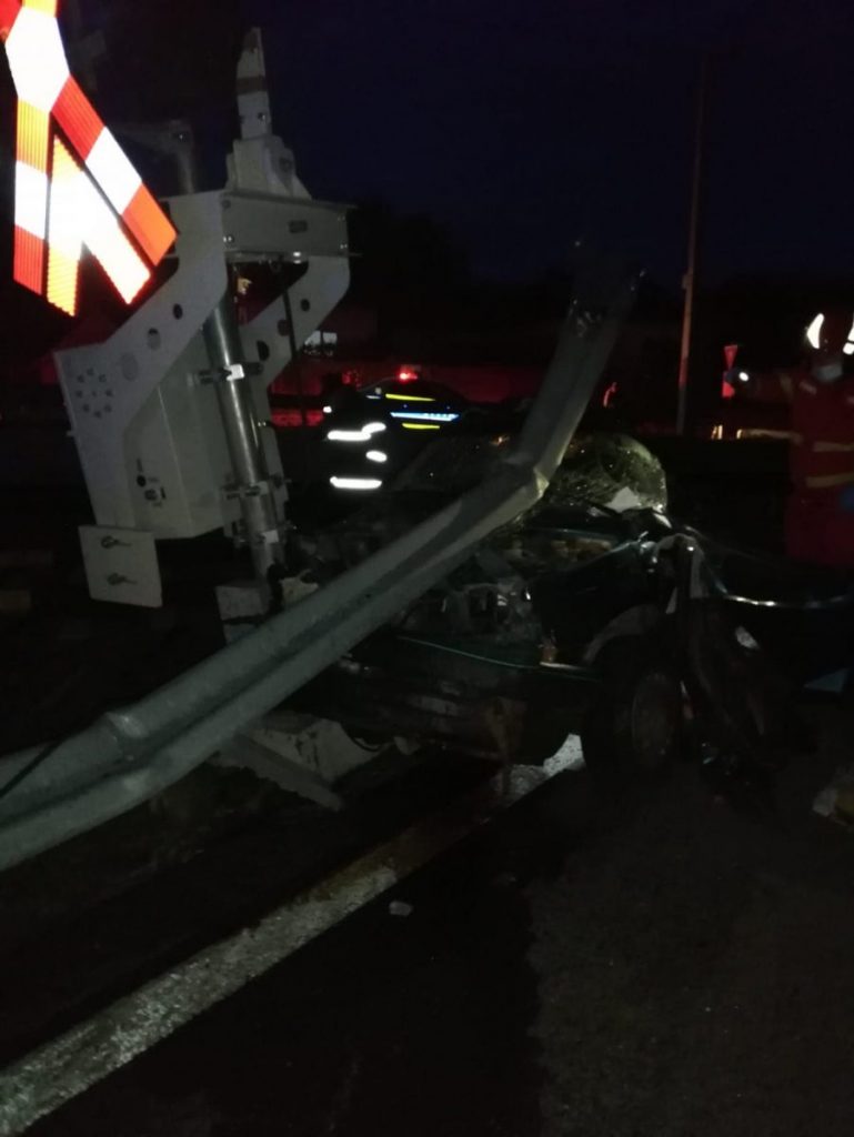 Potrivit polițiștilor, șoferul a rămas blocat pe șinele de tren, între cele două bariere. Pasagerii au reușit să iasă din automobil chiar înainte de impactul devastator.