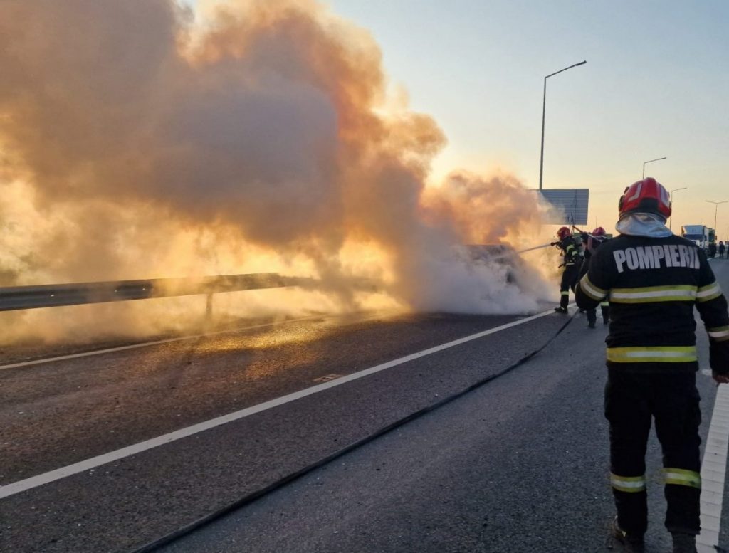 În jurul orei 18.00, pompierii Detașamentului 2 Oradea au fost alertați pentru stingerea unui incendiu izbucnit la o mașină aflată în mers, în Oradea, pe DEx16.