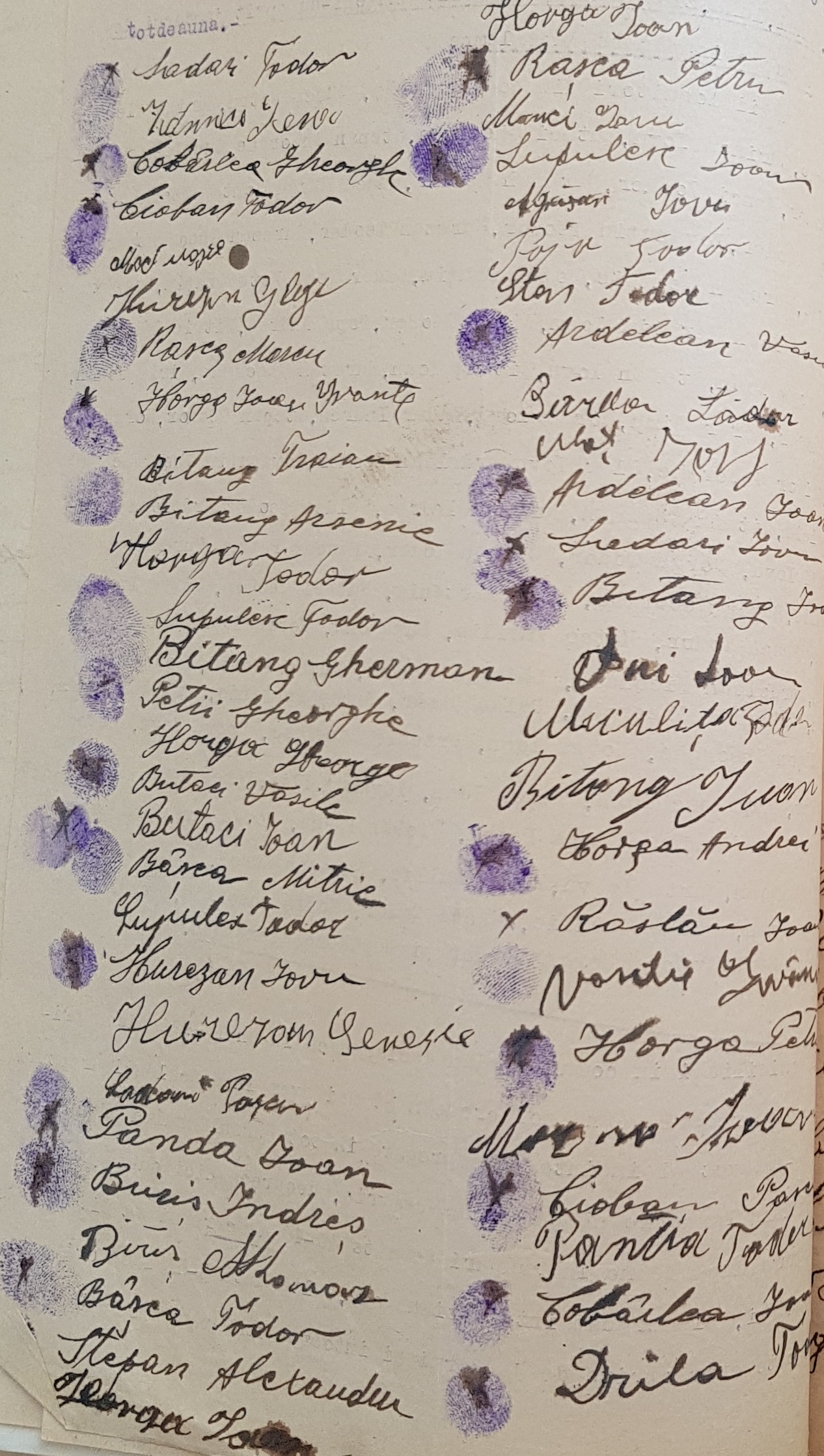 Semnăturile locuitorilor din Nadăş maltrataţi de jandarmi în 1926.