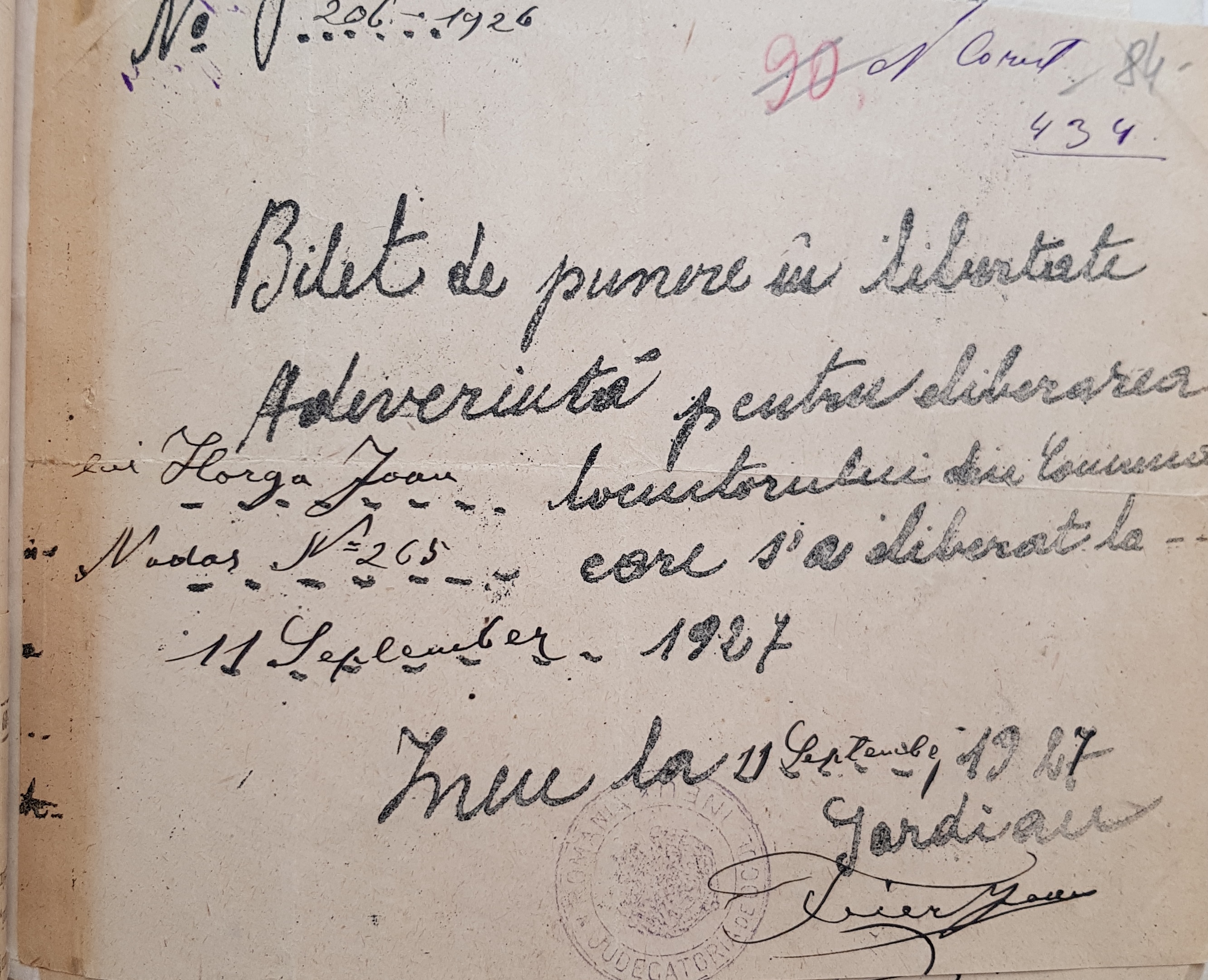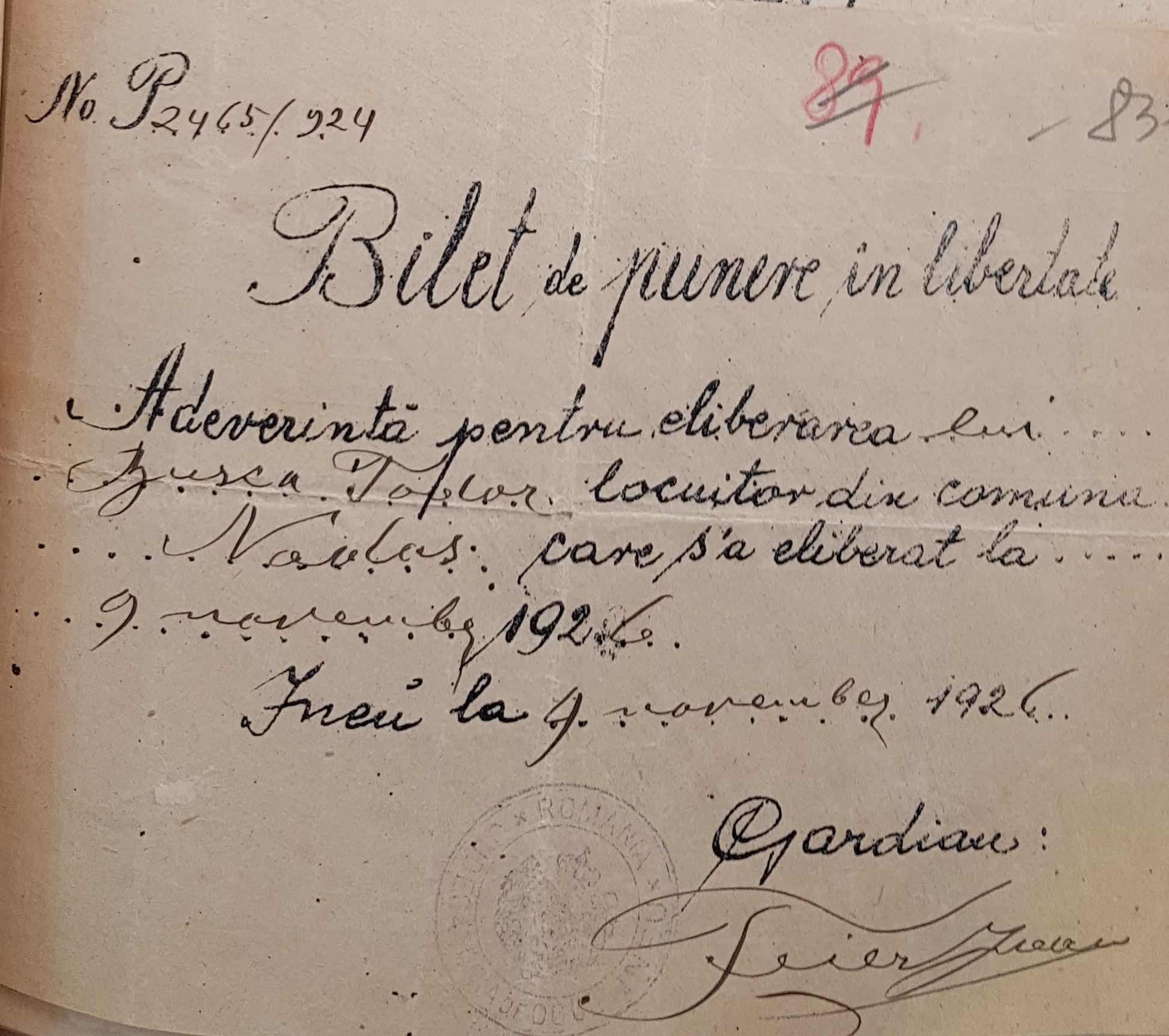 Bilete de punere în libertate a sătenilor din Nadăş, 1926.
