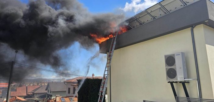 Panouri fotovoltaice situate pe acoperișul unei case din Alba, cuprinse de flăcări