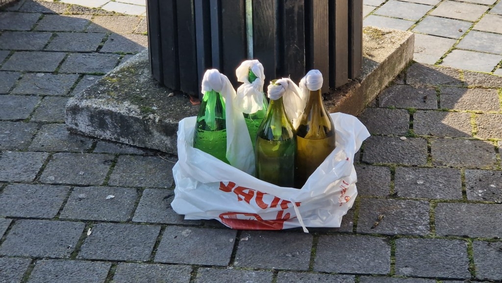 O plasă în care se aflau patru sticle, în genul celor de cocktail Molotov, au fost descoperite miercuri dimineață, într-un tomberon de pe artera pietonală din vecinătatea Catedralei Încoronării din Alba Iulia.