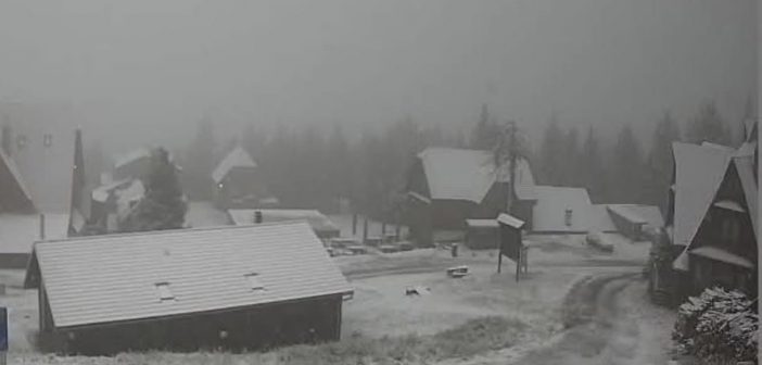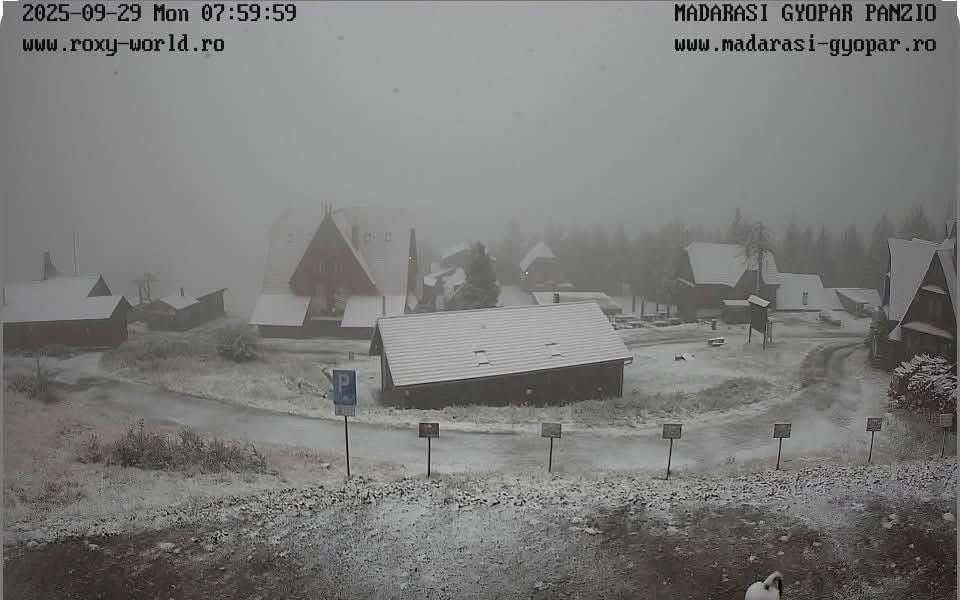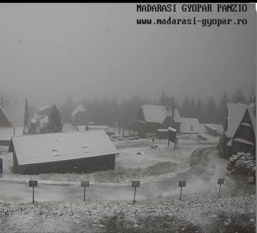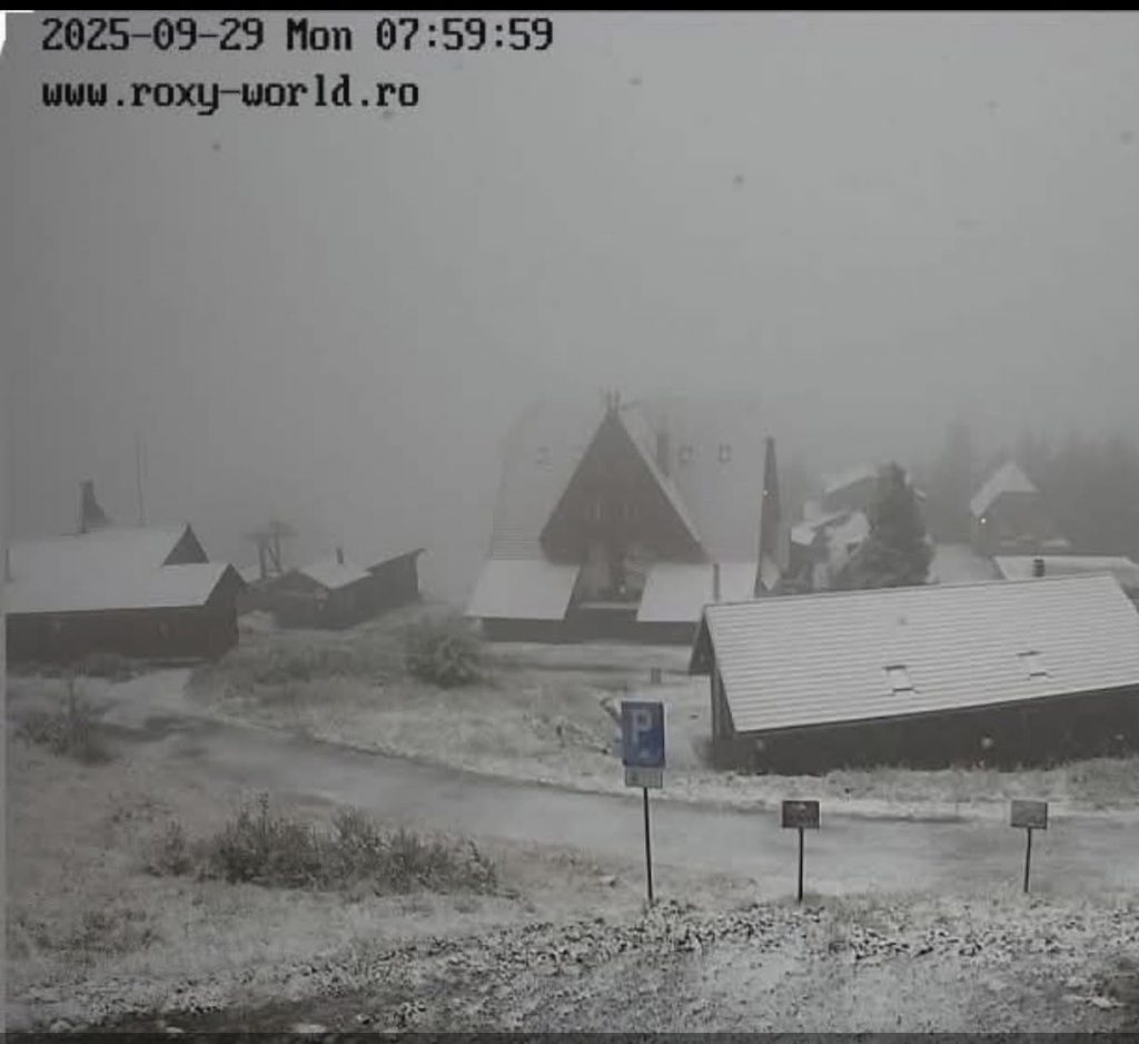 Iarna și-a făcut simțită prezența mai devreme în acest an pe Muntele Harghita-Mădăraș. În dimineața zilei de luni, 29 septembrie 2025, camerele web au surprins o imagine de poveste: acoperișurile pensiunilor și drumurile din stațiune au fost acoperite de un strat subțire de zăpadă.