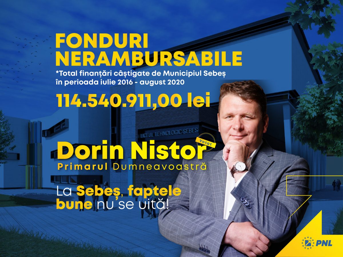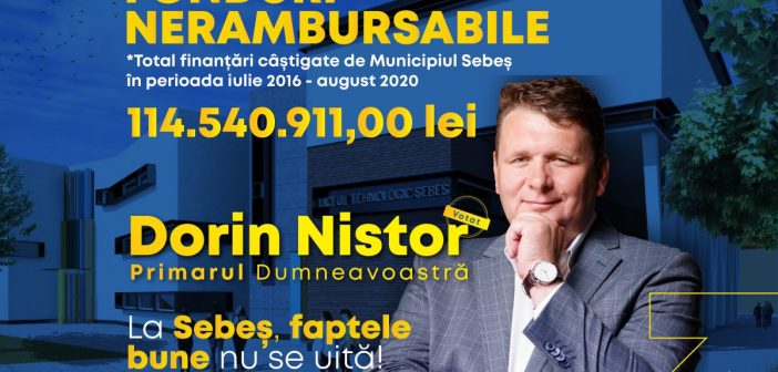 “Finanțările nerambursabile obținute de Municipiul Sebeș grație numeroaselor proiecte depuse și declarate câștigătoare prin programele Uniunii Europene sau prin cele naționale au oferit o gură de oxigen pentru bugetul local. Mulțumesc echipei noastre de proiecte care a demonstrat că și la Sebeș se poate! Atunci când a fost necesar, am beneficiat de consultanță de specialitate de calitate din partea Agenției pentru Dezvoltare Regională Centru, coordonată de dl. director Simion Crețu. Iată că Sebeșul contribuie consistent la ritmul de dezvoltare al județului Alba și se remarcă pe harta României!” declară primarul liberal Dorin Nistor.
