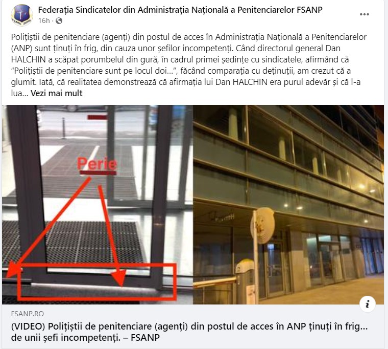 ”Poliţiştii de penitenciare (agenţi) din postul de acces în Administraţia Naţională a Penitenciarelor (ANP) sunt ţinuţi în frig, din cauza unor şefilor incompetenţi. Când directorul general Dan Halchin a scăpat porumbelul din gură, în cadrul primei şedinţe cu sindicatele, afirmând că «Poliţiştii de penitenciare sunt pe locul doi…», făcând comparaţia cu deţinuţii, am crezut că a glumit. Iată, că realitatea demonstrează că afirmaţia lui Dan Halchin era purul adevăr şi că l-a luat gura pe dinainte, fără s-o conecteze cu creierul”, au scris, vineri, pe Facebook, sindicaliştii din penitenciare.