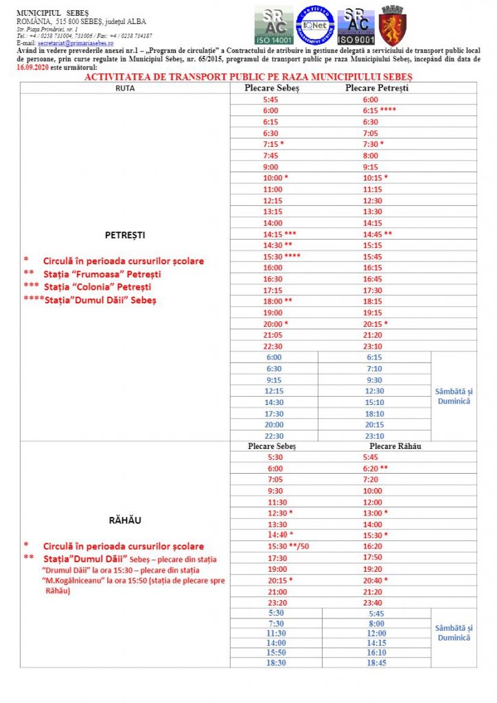Începând de miercuri, 16 septembrie, programul mijloacelor de transport public în comun a fost modificat, anunță primăria municipiului Sebeș.